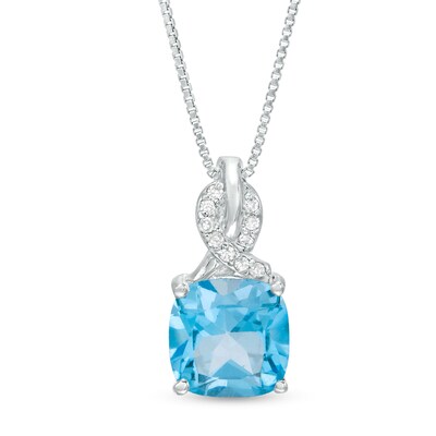 8 0mm Cushion Cut Blue Topaz And 1 20 Ct T W Diamond Ribbon Top Pendant In Sterling Silver Zales
